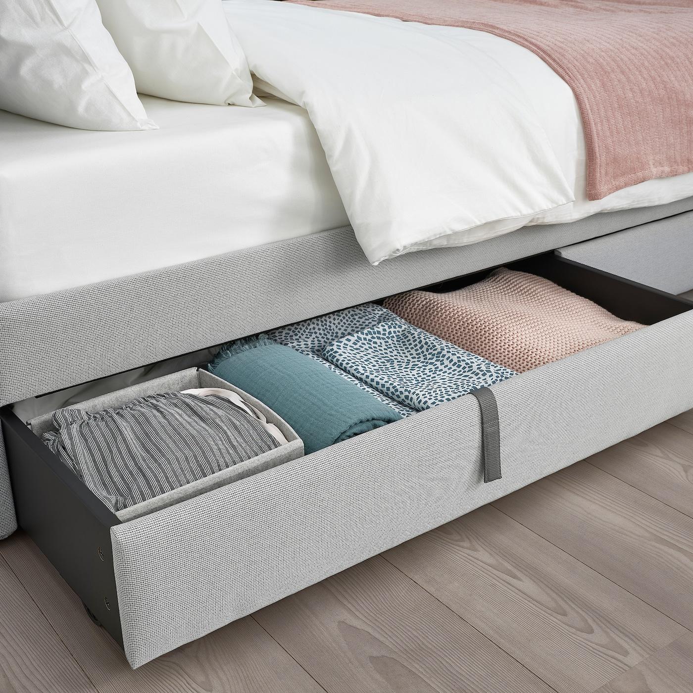 Ящики для хранения имеют такую же серую обивку Кабуса, как и каркас кровати, и идеально помещаются под кроватью.