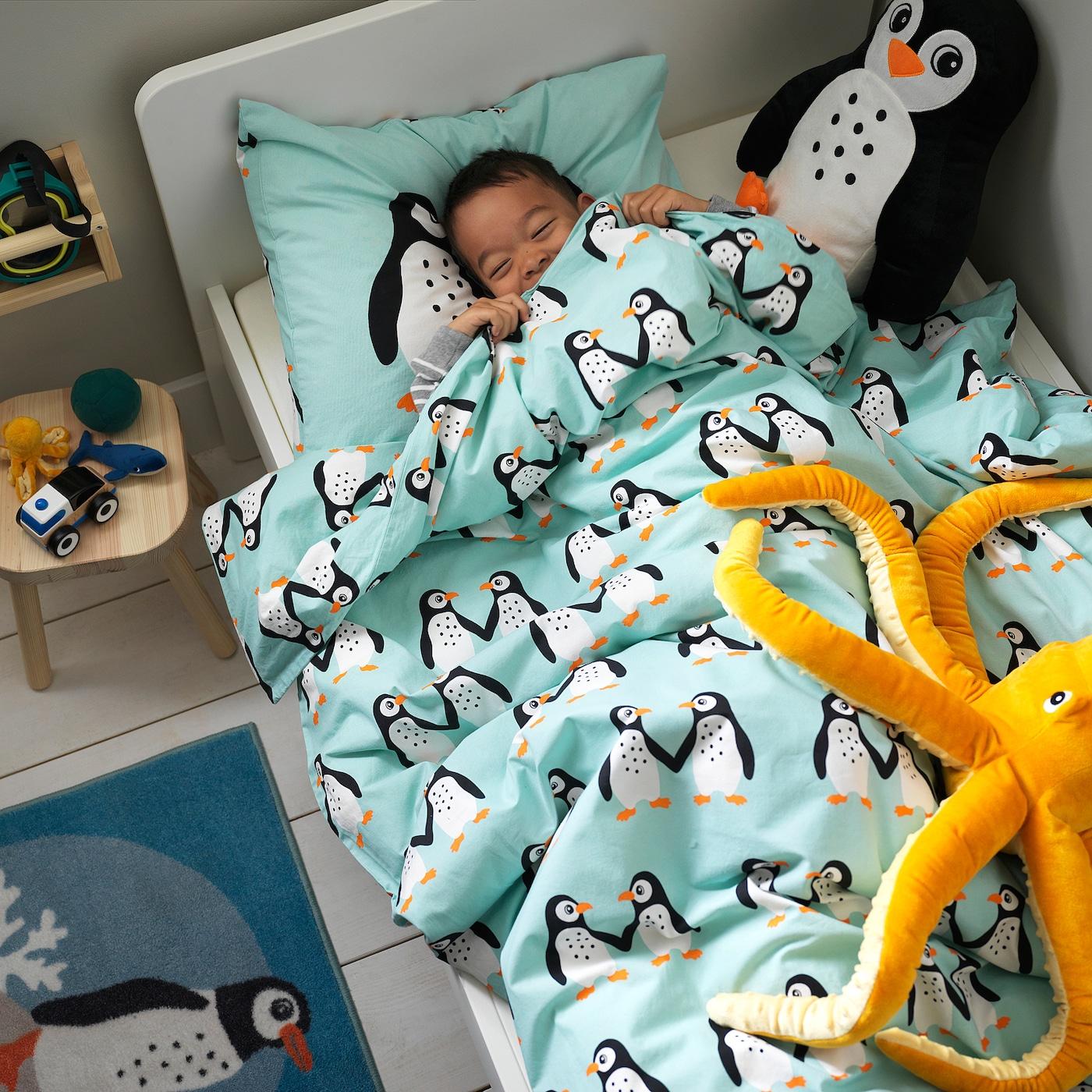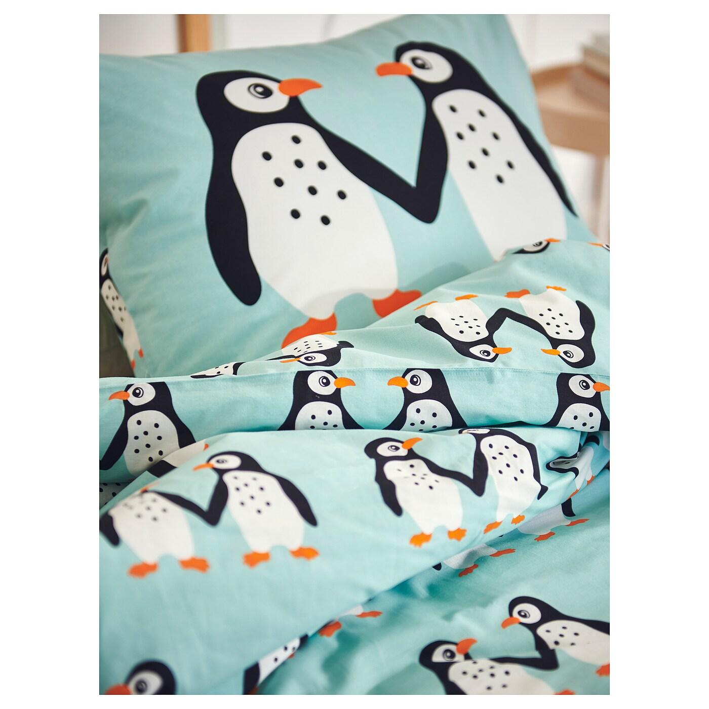 Пингвин, украшающий этот пододеяльник и наволочку, также представлен в виде мягкой декоративной подушки в коллекции БЛОВИНГАД.