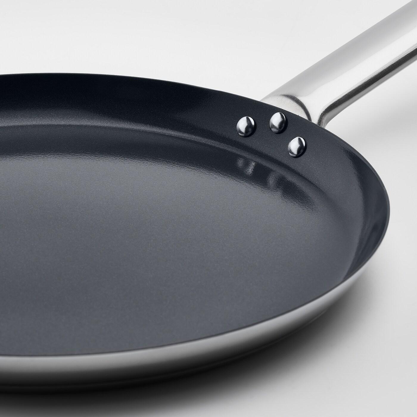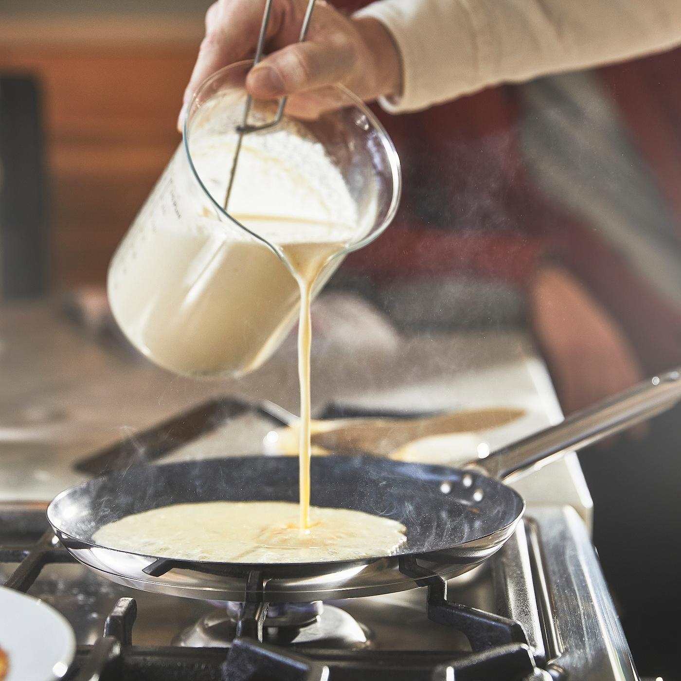 Низкий край и наклонные стенки сковороды позволяют легко переворачивать блины и оладьи.