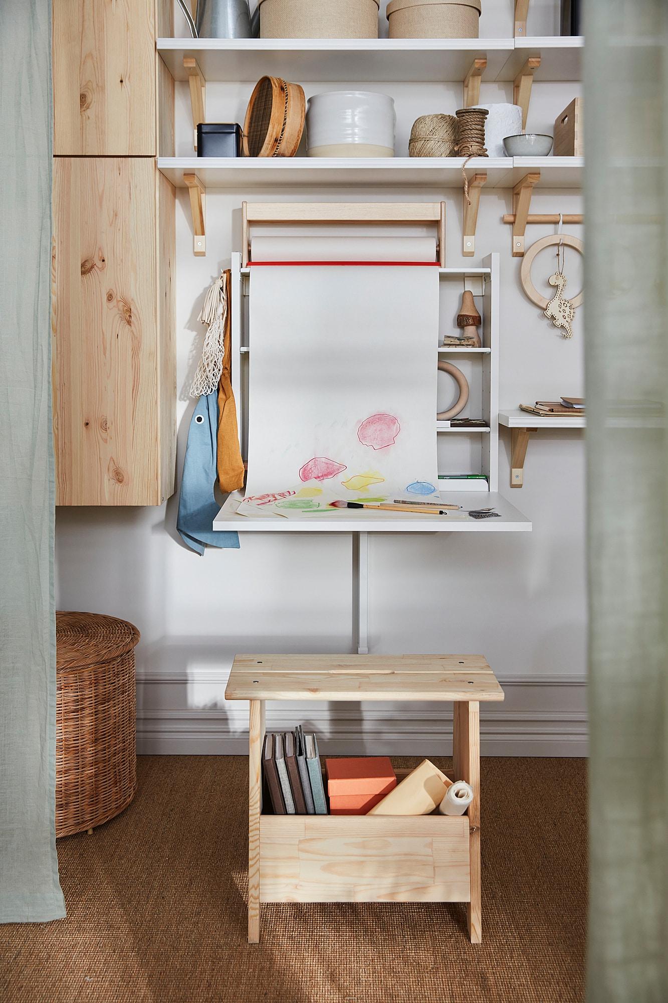 За этим столом, который крепится к стене, с комфортом разместятся двое. Здесь есть регулируемые полки для хранения под рукой всего того, что нужно вам каждый день.