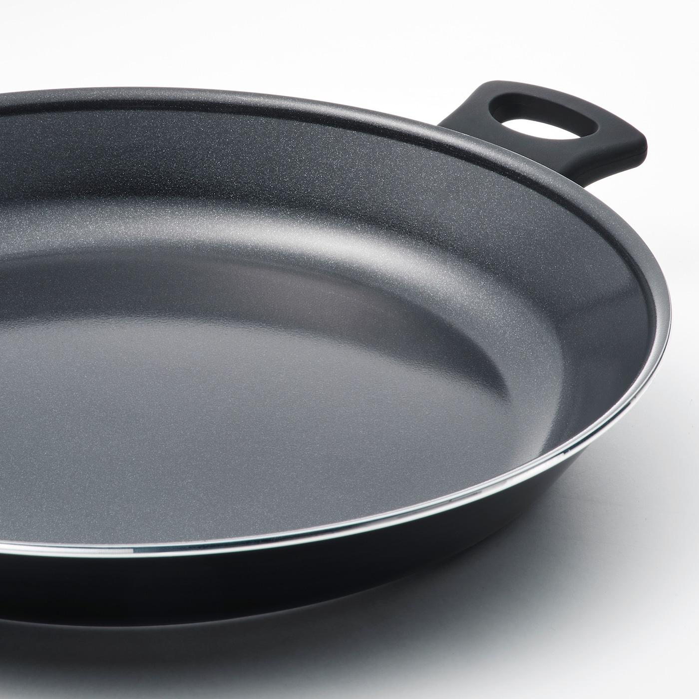 Сделано из алюминия. Этот материал равномерно распределяет тепло и быстро реагирует на изменение температуры, поэтому пища не пригорает и не прилипает к поверхности.