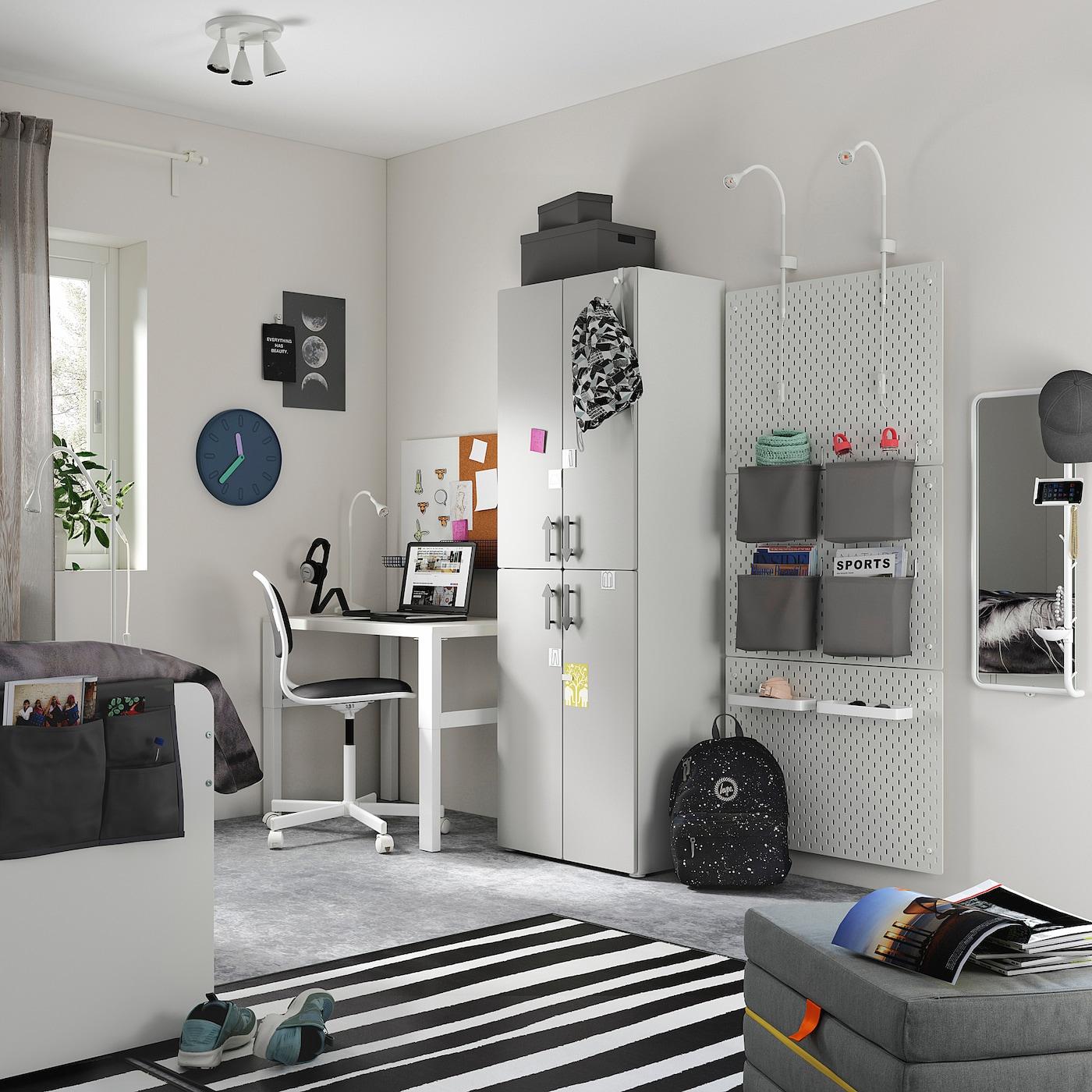 Ребенок может пользоваться этим гардеробом много лет, т. к. глубина шкафа позволяет развешивать в нем одежду на плечиках стандартного размера, а высоту его внутренних элементов можно менять по мере роста ребенка.