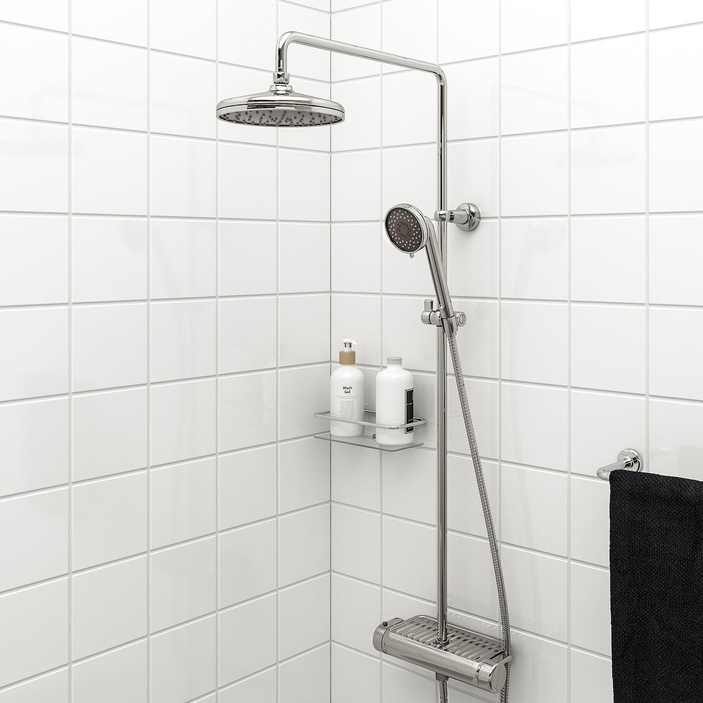 На интегрированную в смеситель полочку можно поставить шампунь и гель для душа, которым бывает так трудно найти удобное место.