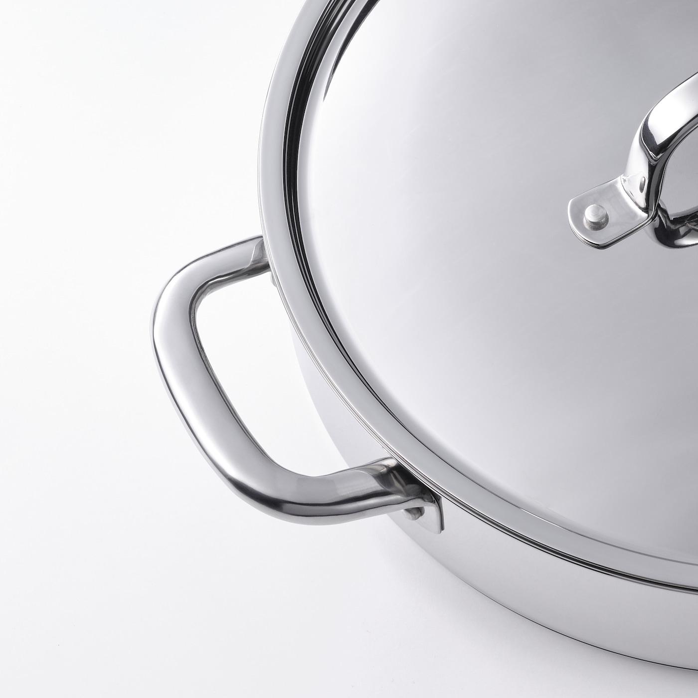 Трехслойная конструкция дна: слой алюминия между двумя слоями нержавеющей стали. Обеспечивает равномерное нагревание, поэтому пища не пригорает и не прилипает к поверхности.