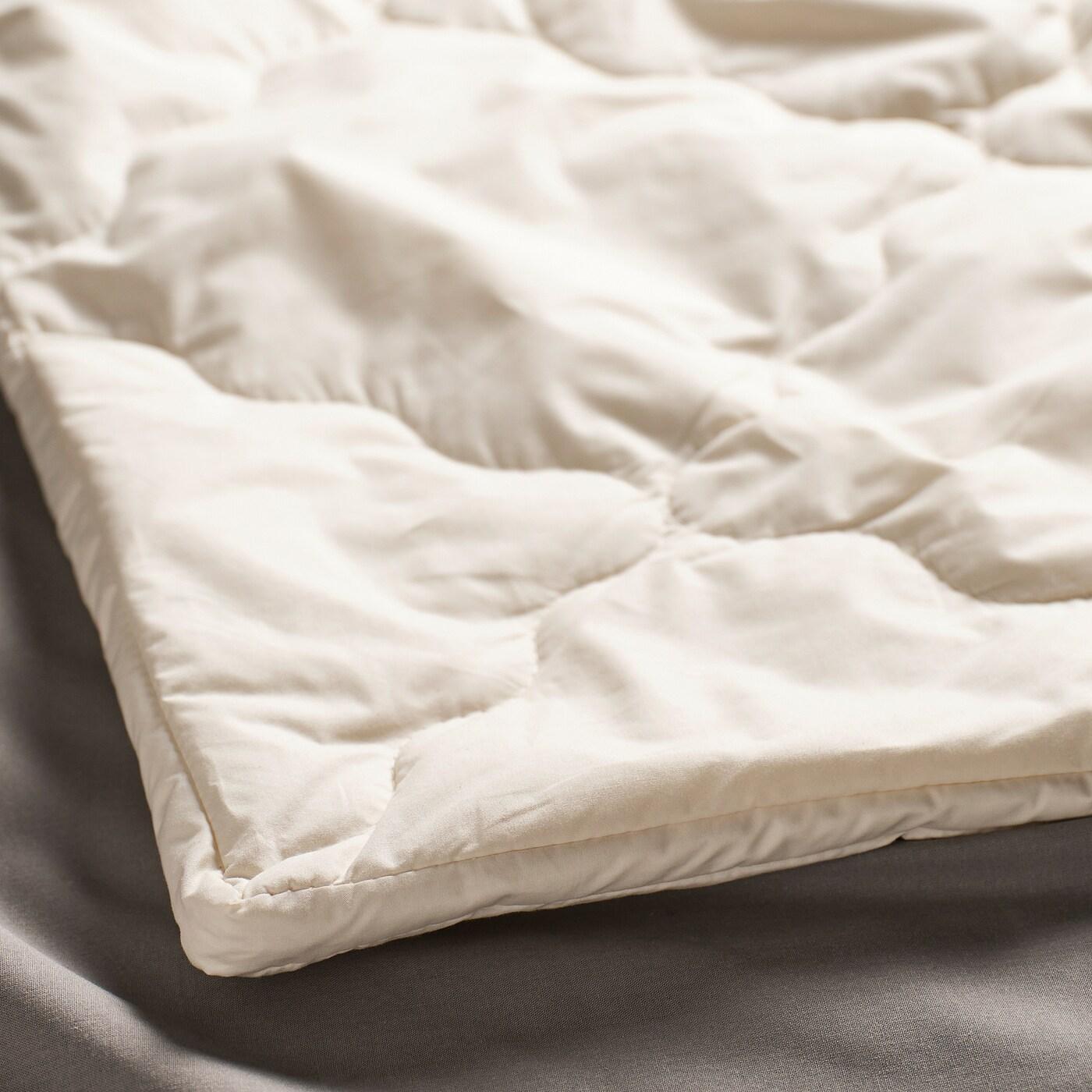 Теплое одеяло из натуральных волокон; чехол из 100%-го неотбеленного и неокрашенного хлопка и наполнитель из шерсти.