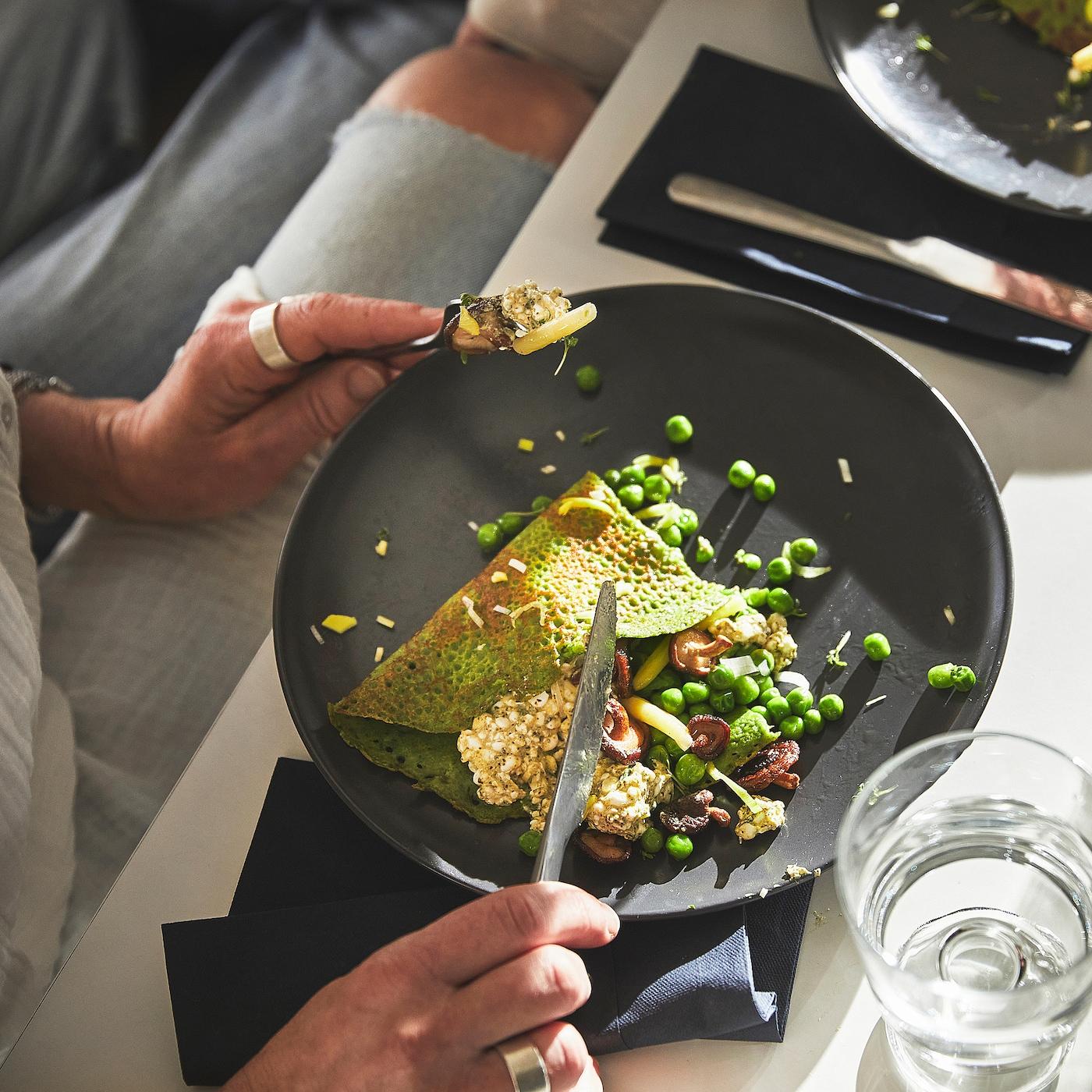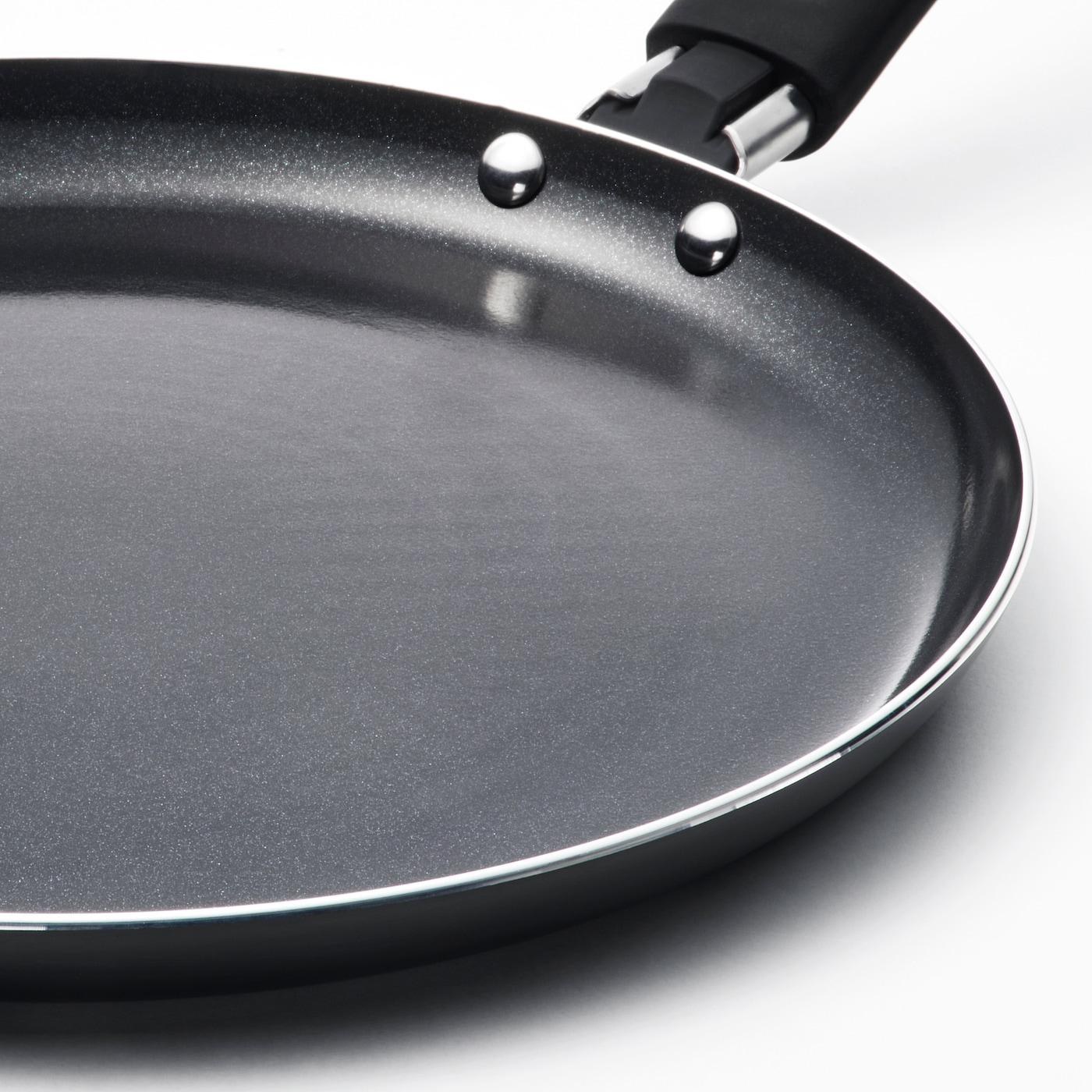 Низкий край и наклонные стенки сковороды позволяют легко переворачивать блины и оладьи.