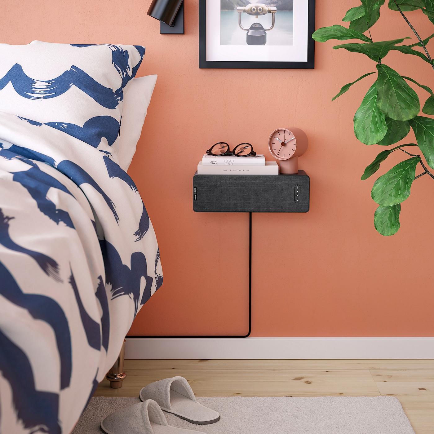 Динамик можно повесить на рейлинг или настенную решетку КУНГСФОРС с помощью крючков СИМФОНИСК, продаются отдельно.
