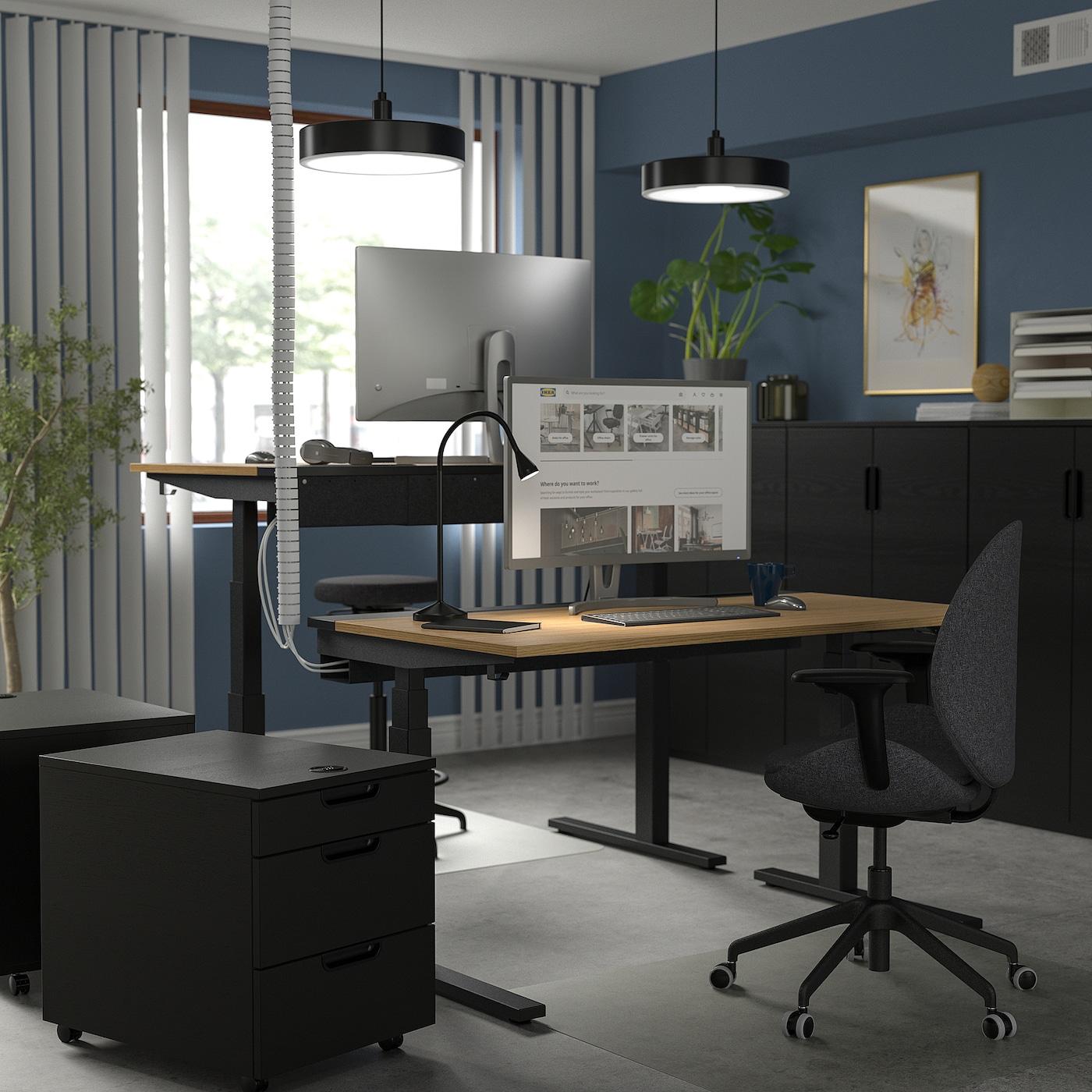 Провода можно убрать в отделение стола с крышкой и провести под столом в лоток для размещения проводов.