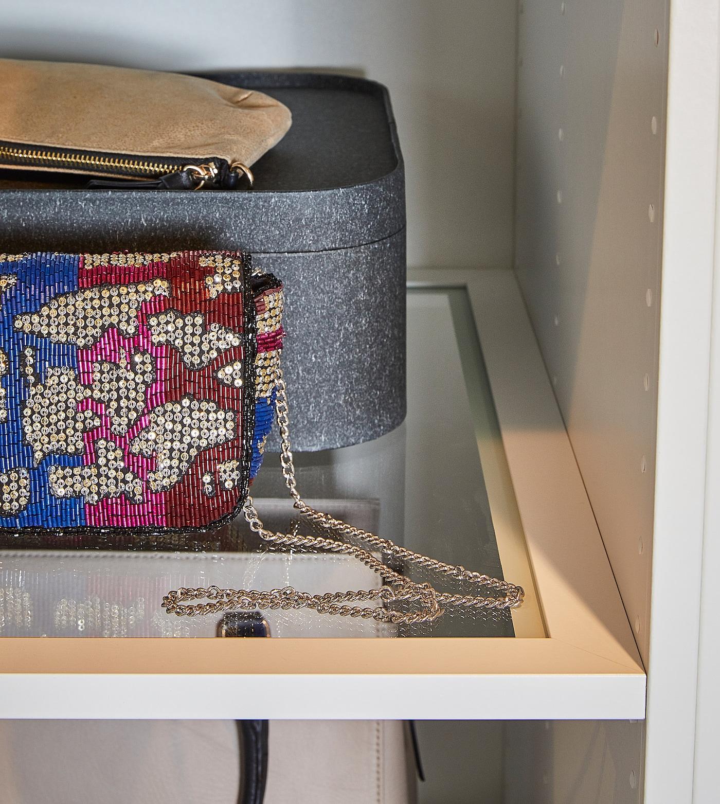 Размещение стеклянной полки на более высоком уровне в гардеробе обеспечит обзор вещей, которые находятся дальше от края полки.