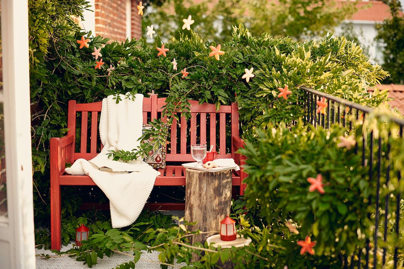 Красный цвет оживит пространство балкона и придаст садовой скамье выразительность в вашем зеленом оазисе.