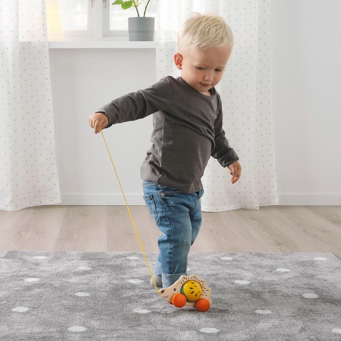 Деревянная конструкция подходит для детей, которым нравится поднимать, бросать, толкать и тянуть игрушку.